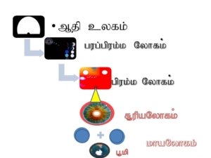ஆதி தன்சக்தியை முன் நிறுத்தி தானே ஆத்மாவாக பின் தொடர, ஆதிசக்தியில் ஏற்படும் மாற்றங்களே பரப்பிரம்மலோகம் அல்லது ஆதி லோகத்தில் உள்ள ஒரு கார்பன் அணுவின் அதிர்வலைகளில் ஏற்பட்ட மாற்றமே பரப்பிரம்மலோகம், இவை பல அடுக்குகளாக அல்லது பல லோகங்களாக (ஒன்றுக்குள் ஒன்று மாறுபட்ட வாயுக்கோளங்களாக) உருவாகுகிறது.